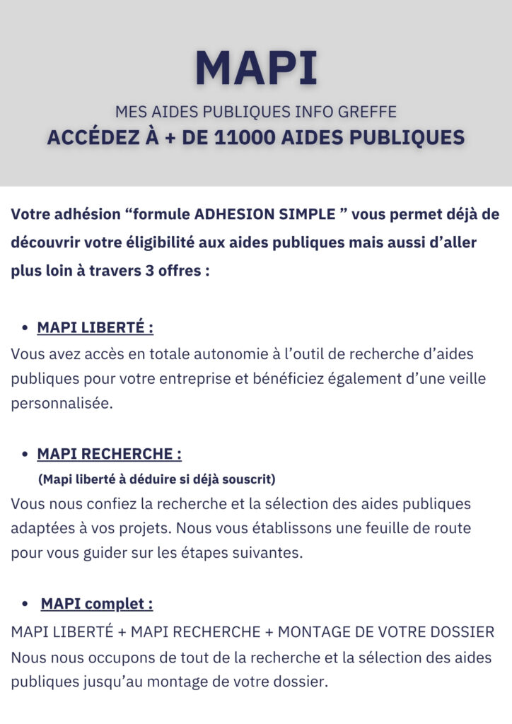 Grâce à un partenariat avec la plateforme MAPI (Mes Aides Publiques Infogreffe), le CGA66 vous accompagne dans la recherche et l’obtention des aides publiques grâce à une plateforme performante recensant plus de 11000 aides, optimisée grâce à l’intelligence artificielle, à des filtres avancés et une veille automatisée.